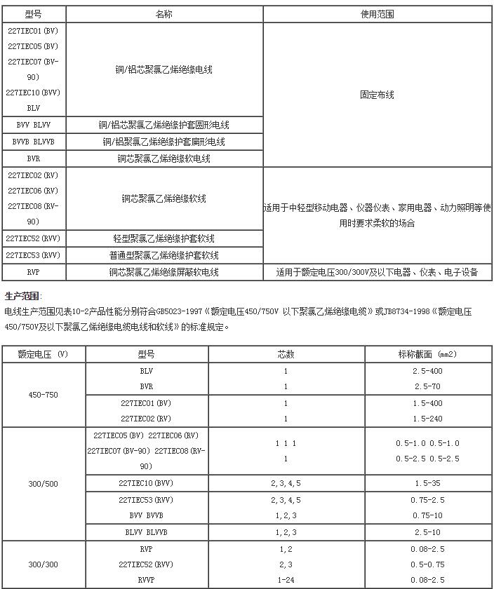 |本产品适用于交流额定电压450/750V及以下的家用电器、小型电动工具、仪器仪表及动力照明装置电源连接,其型号、名称及使用范围见表。电线的工作温度除BV—90、RV—90为90℃外,其余均为700℃。